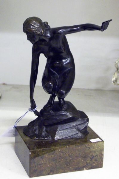 Kvinna hukande på sten med snäcka i handen, på stensockel