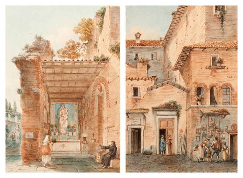 | Rue de Rome avec oratoire et ex-votos - Vue d'un oratoire dans les Termes de Dioclétien à Rome | |