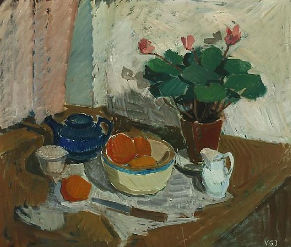 | Still life on a table with tea, fruit and a pottet plant. | |