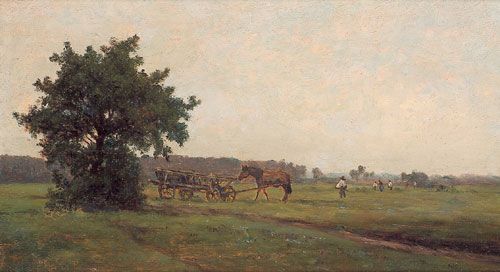 | Wiesenlandschaft mit Bauern bei der Heuernte, links ein großer Baum. | |