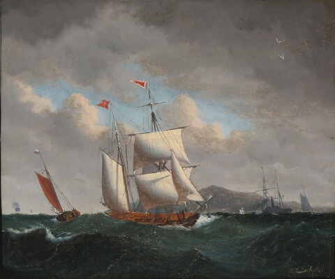 Seascape with sailing ships and boats off the coast.