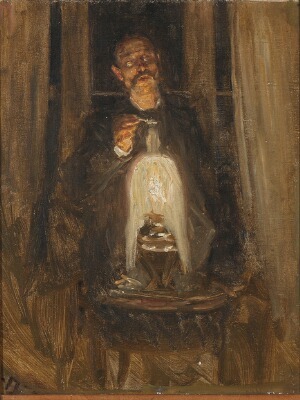 | Portrait of the painter Julius Paulsen lighting a kerosene lamp | |