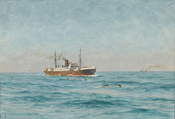 | A steamer escorted by dolphins on the Atlantic Ocean | |