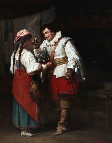 | An elegant Roman gentleman is offered a glass of red wine by a young woman | |
