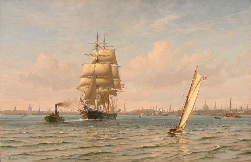 | A tugboat pulls a sail ship out of Copenhagen Harbour. | |
