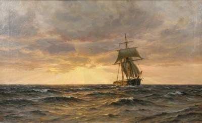 | Zweimaster auf hoher See bei Sonnenuntergang | |