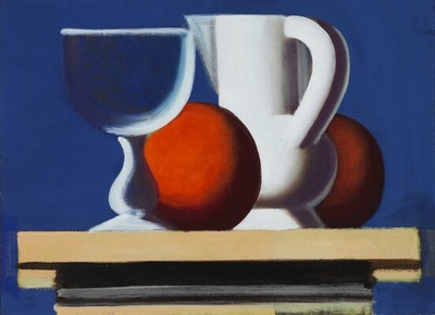 | Still life with glass, white jug and two oranges | |