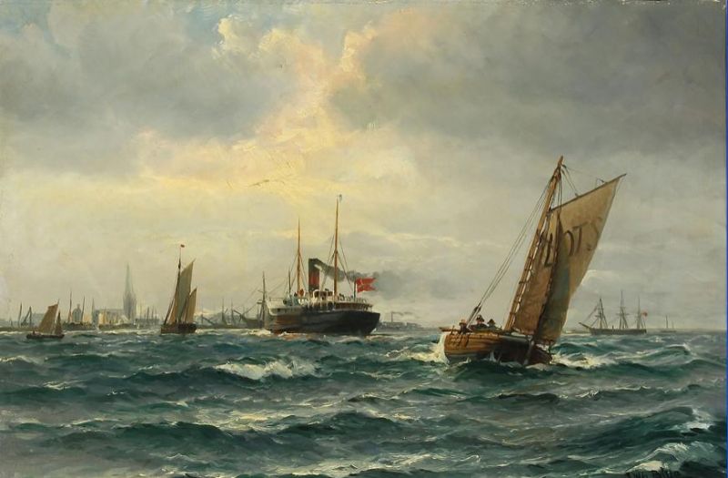 | Seascape from the bay of Aarhus with lively shipping. | |