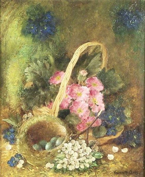 A STILL LIFE OF A BASKET OF FLOWERS AND A BIRD'S NEST ON A MOSSY BANK