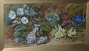 | Daffoldils, pansies, convolvulus, apple blossom and a bird's nest against a mossy bank | |