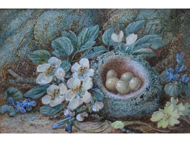 PRIMROSES AND A NEST OF EGGS BY A MOSSY BANK