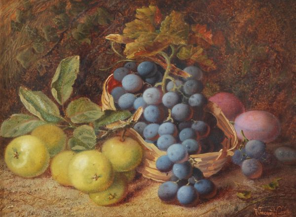 Still life of grapes, plums and apples on a mossy bank