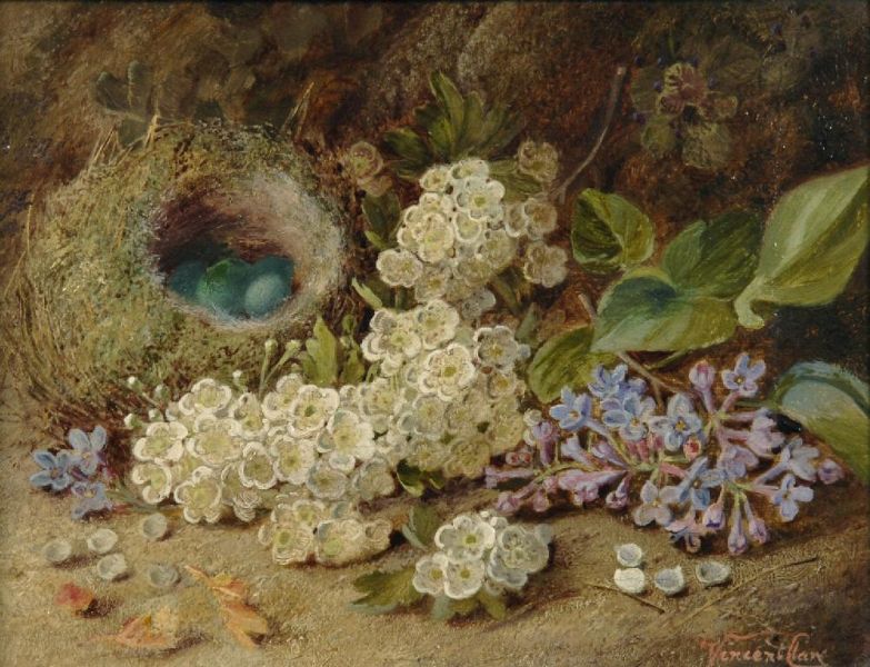 STILL LIFE OF SPRING FLOWERS AND A BIRD'S NEST