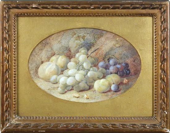 Still life of white and black grapes and greengages on a mossy bank