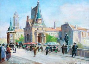 | Berliner Mühlendamm mit Schleusenhäuschen. Belebte Straßenszene | |