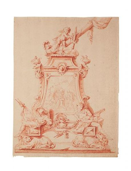| STUDIO DI OGGETTO DECORATIVO SORRETTO DA DUE LEONI CON PRIGIONI E RAFFIGURAZIONE AL CENTRO DELLA FUCINA DI VULCANO | |
