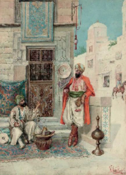 | Arabic Gentlemen in discussion, with a street scene beyond | |