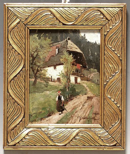Schwarzwaldlandschaft mit Frau in Tracht vor Gehöft.