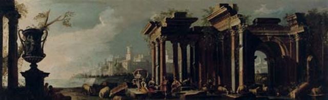 | A 'capriccio' view of an Italianate coast with figures conversing among ancient ruins, a harbour town beyond | |