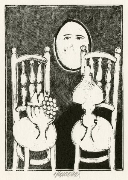 Zátiší s portrétem, židlemi, petrolejovou lampou a mísou s ovocem