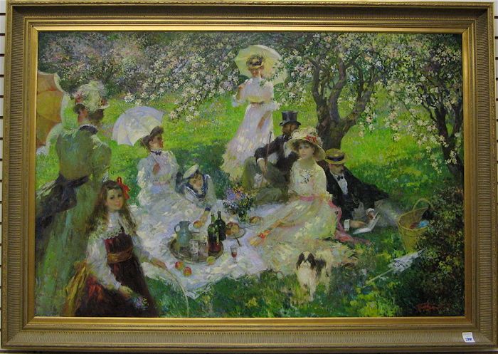 | Landscape with picnic party of eight men, women and children under flowering apple trees | |