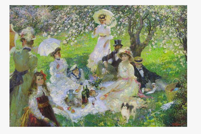 Landscape with picnic party with eight men, women, and children under flowering apple trees