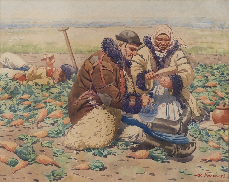 Muž a žena ve slováckém kroji při sklizni řepy - svačina