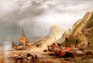 Studies of fishing boats drawn up on to a beach at low tide