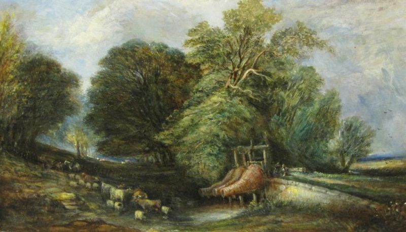 A wooded Landscape with animals crossing a river, near a lock-gate
