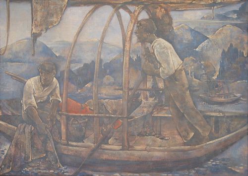 | Two fishermen at work on a small boat, a mountainous landscape in the background | |