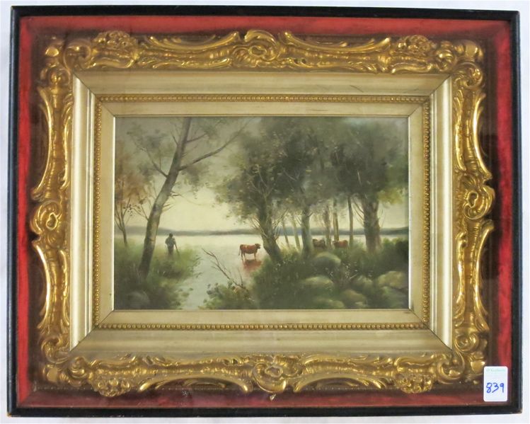 pastoral landscape with man and cattle by a lake