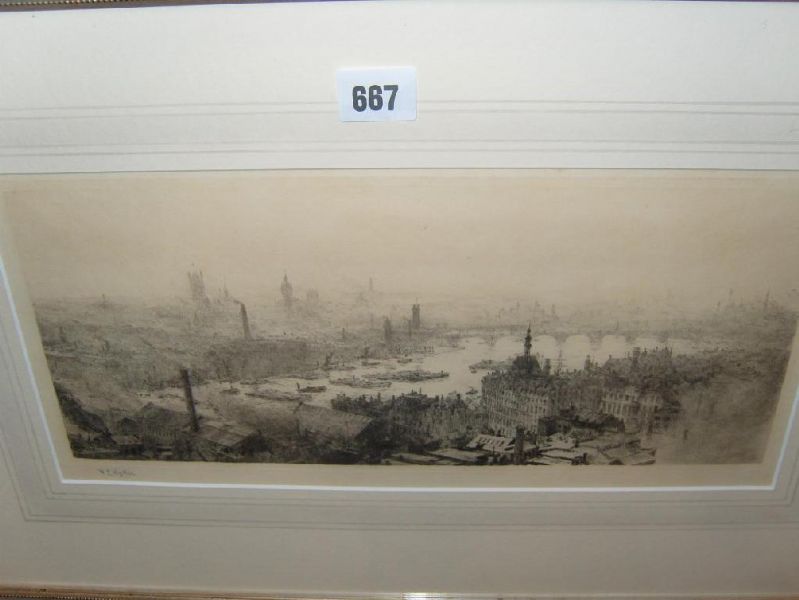 | A panoramic London cityscape with the Thames, shipping, smoking chimneys, distant churches | |