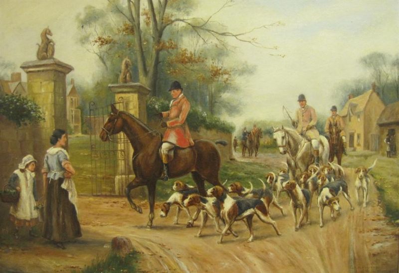 A Hunting scene with Hounds and Huntsman entering a country Estate