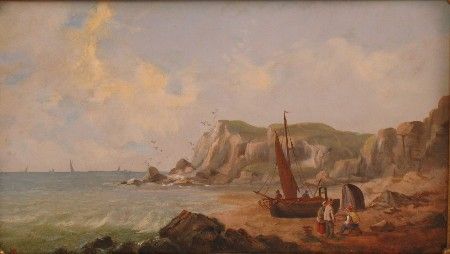 coastal landscape with fishing boat and figures on the shore
