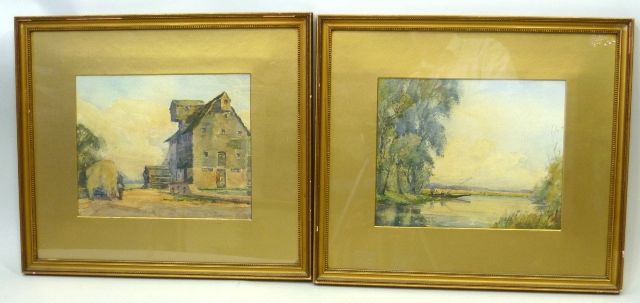 Figures fishing from a punt with calm river and trees, and COMPANION, of barn and hay cart,