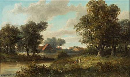 Summer landscape with picturesque trees and personal stroll along the river bank