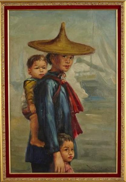 MOTHER AND HER CHILDREN IN A HONG KONG HARBOUR