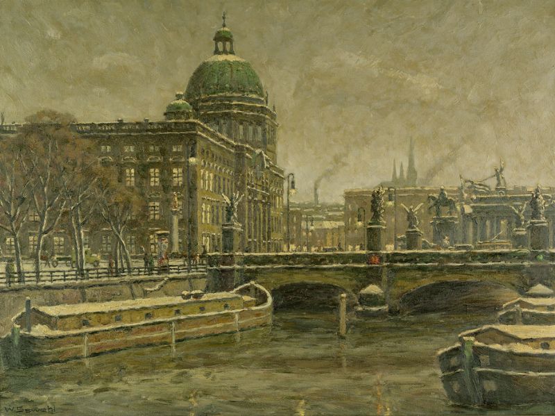 | Blick über die Spree auf das Berliner Schloss, im Vordergrund die Schlossbrücke mit dem Reiterdenkmal Kaiser Wilhelm I | |