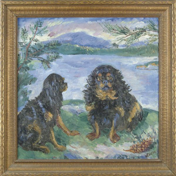 | Oil on canvas scene shows two black and brown dogs seated on a grassy bank next to a lake with mountain background. | |