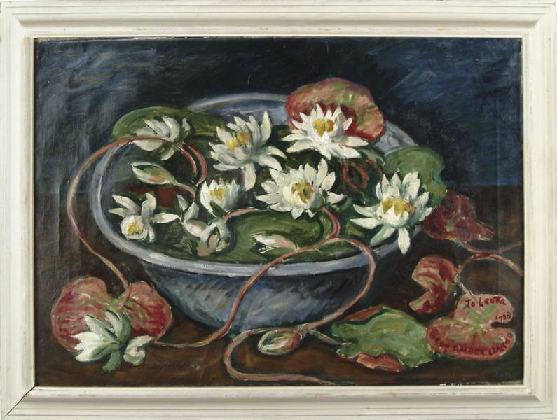 | Oil on canvas still life shows a blue wash bowl filled with white blooming pond lilies with several falling out on the tabletop. | |