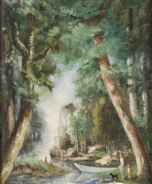 Figures bathing in a woodland pool
