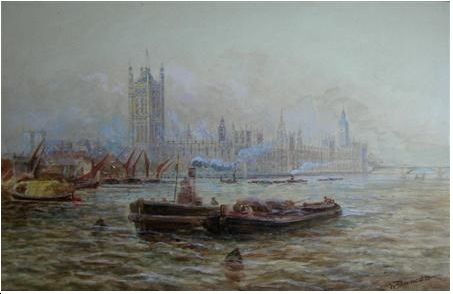 BARGES ON THE THAMES WITH THE HOUSES OF PARLIAMENT