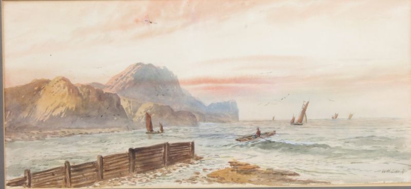 study of fishing boats off a rocky coast line