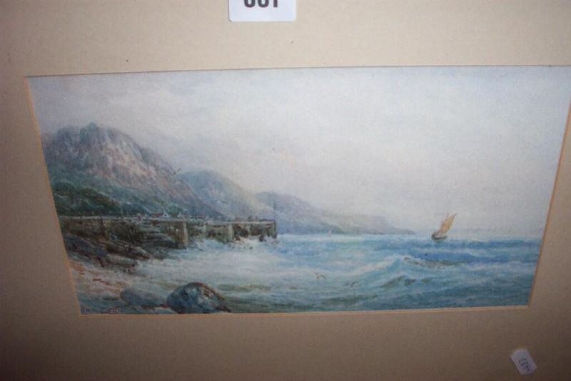 a coastal scene on a stormy day with sailing boat, figures on a jetty,