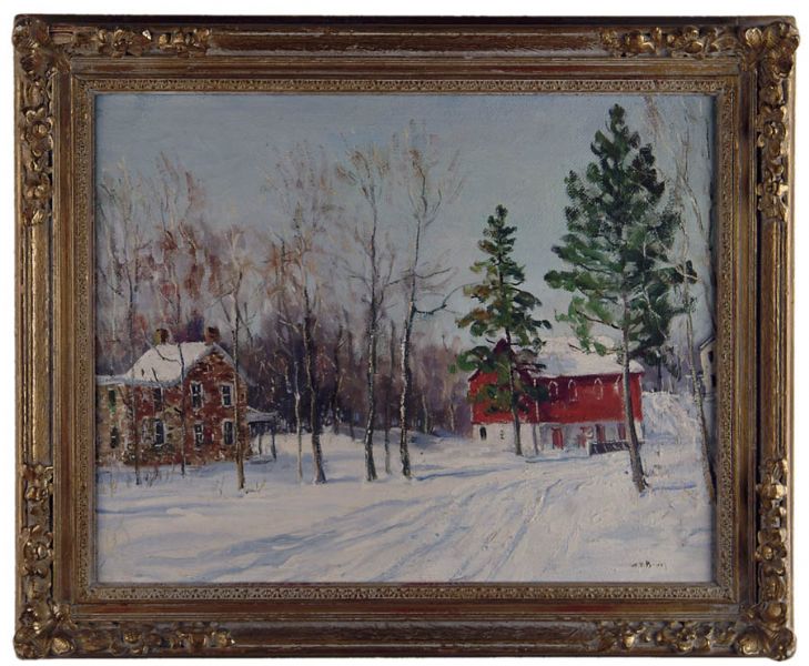 | Oil on masonite shows a snow covered ground with red and white barn at the end of a snow covered road | |