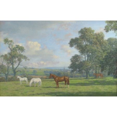| East Yorkshire landscape scene with horses grazing in a field overlooking a village with Church spire | |