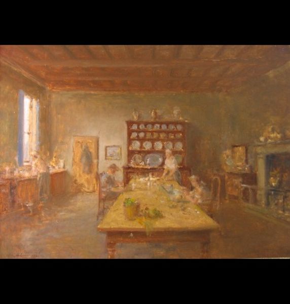 | farm house kitchen with figures at the table cleaning/cooking, a female by the window washing | |