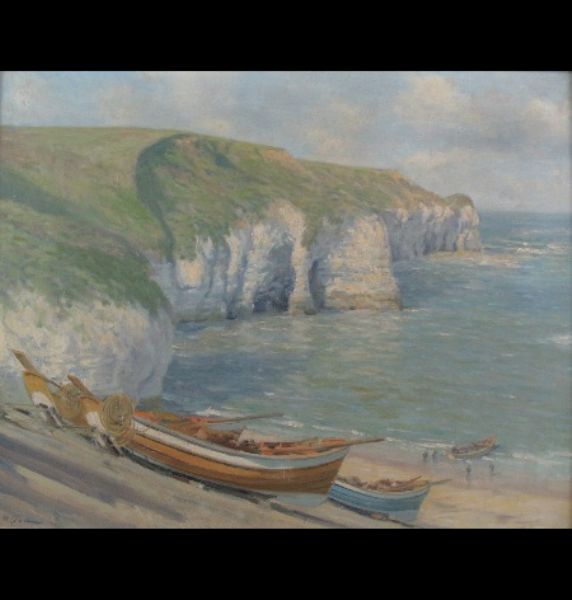 | North landing, Flamborough, coastal scene with beached sailing boats in the foreground, figures in the water and cliffs in the b | |