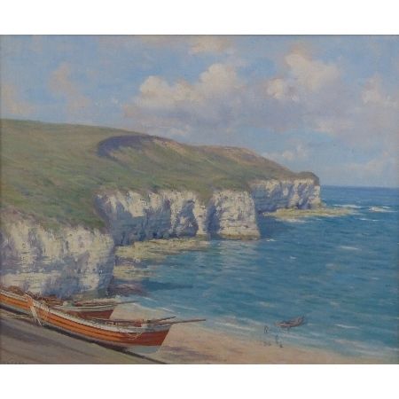 | North Landing Flamborough, with beached fishing boats in the foreground and another with figure at the waters edge | |