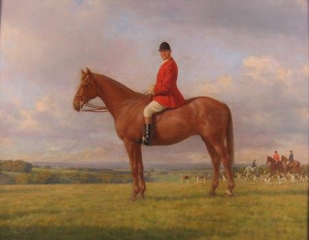 | portrait of a huntsman mounted on a chestnut mare, further riders and hounds in the distance standing on the Yorkshire Wolds (po | |